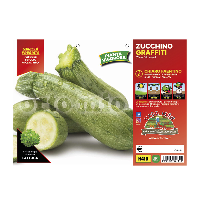Nuovo zucchino tipo faentino o “greyzini” professionale, di 15-18 cm, dal sapore dolce. Ha colore verde chiaro brillante, con le tipiche striature scure. Buona la tenuta del fiore nei giovani frutti. Pianta di medio vigore, compatta ed eretta, che facilita l'individuazione dei frutti. Discreta anche la produzione di fiori maschili, di buona qualità. Accept migliora Graffiti grazie alla maggiore resistenza a 4 virus (ZYMV, PRSV, CMV, WMV) e mal bianco e alla qualità dei frutti. Entra in produzione dopo circa 40 giorni dal trapianto e i primi frutti vanno staccati rapidamente, per rinforzare la pianta, come per le altre zucchine. Per un'efficace prevenzione del mal bianco, supportare la naturale resistenza al patogeno di Accept con trattamenti a base di zolfo o bicarbonato (bio), da inizio produzione, (40 giorni dopo il trapianto), intervenendo ogni 10 giorni. Sostituire le piante esaurite dopo circa 2 mesi. Varietà esclusiva Orto Mio.